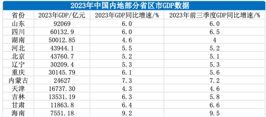 與各自2023年前三季度相比,湖南、河北、北京、重慶、內(nèi)蒙古、吉林全年GDP增速加快,山東、遼寧全年增速與前三季度持平。
