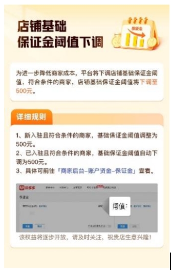 9月5日,拼多多最新發布的商家通知顯示,商家店鋪的基礎保證金將從1000元下調到500元,新入駐的個人店鋪、企業店鋪初始化保證金也將下調至500元。