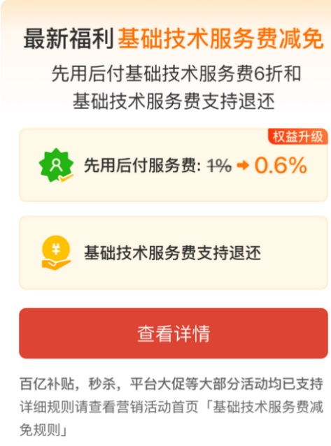▲最近,拼多多升級了商家技術服務費退返權益,先用后付技術服務費降至六折。